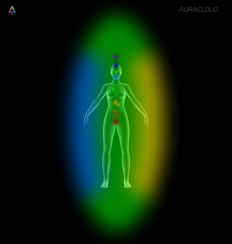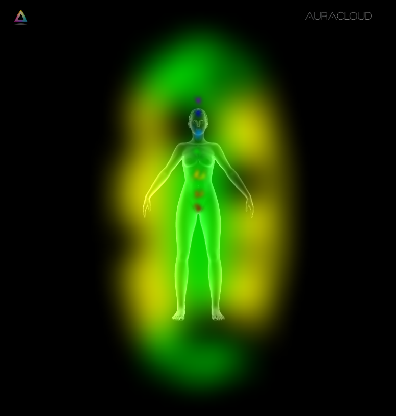 Gelb-grüne Ausstrahlung weist auf Leichtigkeit, Klarheit und Stabilität im aktuellen Moment hin. Der blaue Anteil auf der rechten Seite kann dabei sowohl für Kommunikationsfähigkeit als auch für ein mögliches Zurückhalten von Ausdruck stehen – je nach innerem Zustand in diesem Moment.